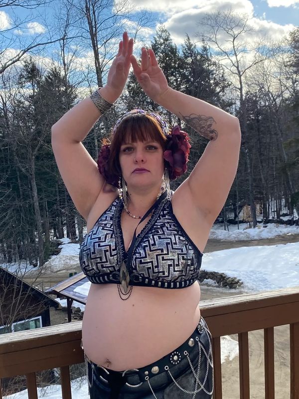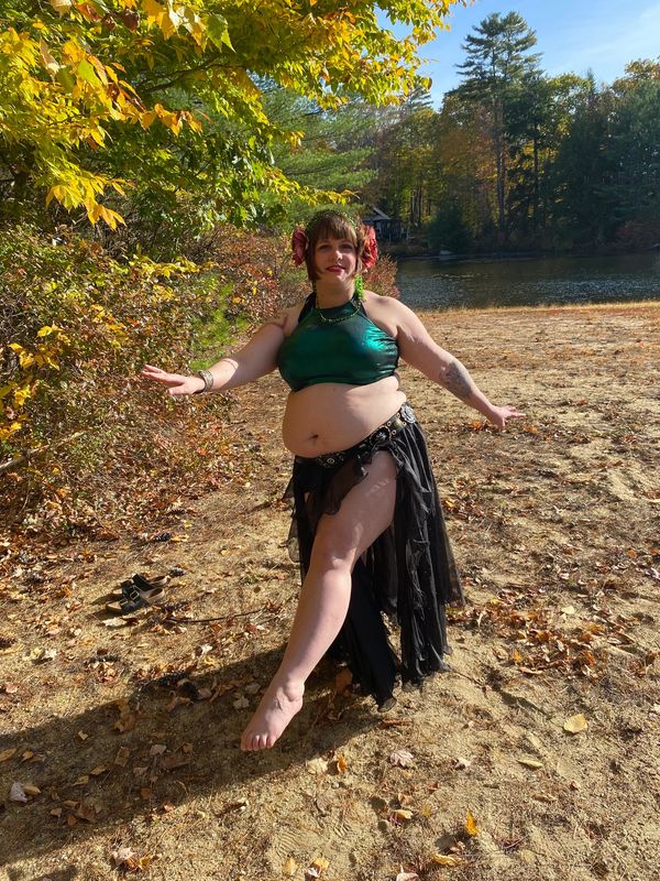 Katie is a fusion belly dancer from NH who started her dance journey about four years ago. She has participated in both individual and troupe performances. Katie is currently studying with Daewen of the Stygian Collective and Sara Lyn of Vimana Fusion. She is Level One and Level Two certified, along with teacher certification from the Stygian Collective. Katie loves this dance style for its sense of expression, creativity, theatricality, magic and community. She believes class should be a safe space to learn and accessible regardless of gender, age, race, size and/or other factors. Most of all she wants dance to be fun!